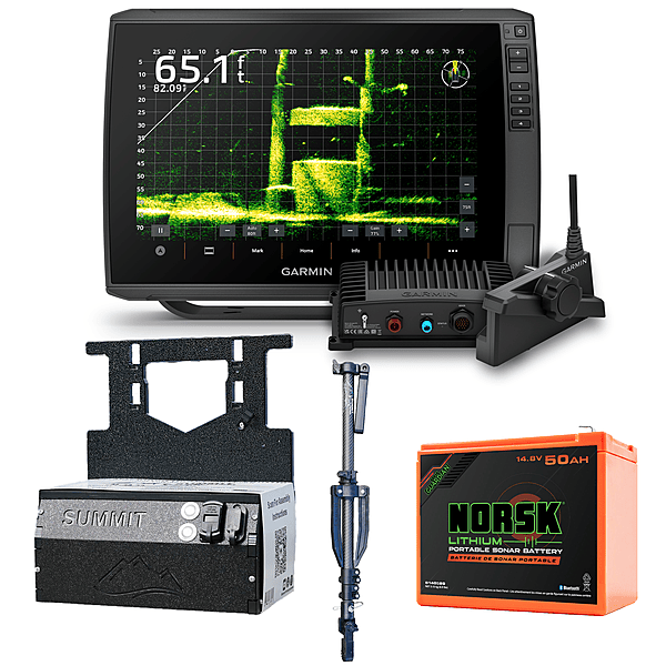 Command the ice with this elite fishing system built for competitive winter performance. The Garmin ECHOMAP Ultra2 126sv paired with LVS34 and GLS10 transducers delivers exceptional sonar clarity and live underwater observation for precise fish location. The Summit Fishing HD CNC Shuttle holds the screen solid while the lightweight 24"-60" carbon fiber ice pole grants intuitive transducer positioning and rapid deployment between holes. The Norsk 14.8v 50Ah lithium ion battery with 3A charger sustains full-day operations in harsh subzero conditions without compromise. A battle-tested, integrated solution engineered for anglers who demand uncompromising technology and field reliability.