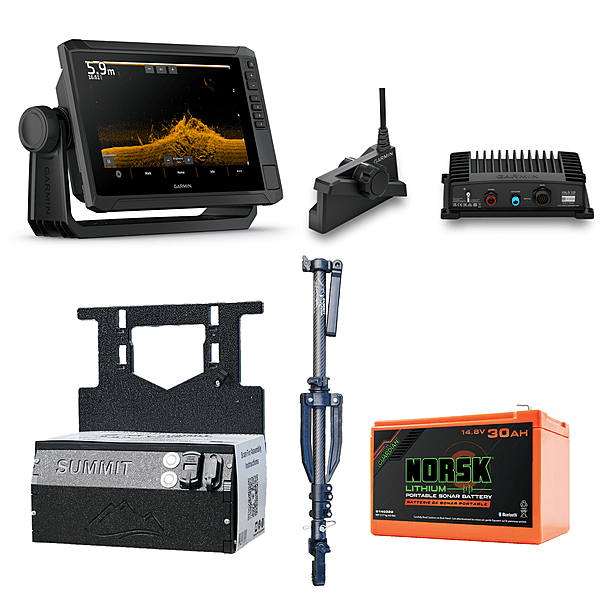 This comprehensive ice fishing system combines cutting-edge sonar technology with premium mounting hardware for complete on-ice capability. The Garmin EchoMAP UHD2 95SV chartplotter delivers high-definition imaging, while the LiveScope Plus System with LVS34 and GLS10 transducers provides real-time underwater visualization. The Summit Fishing HD CNC Shuttle offers precision transducer control, paired with a durable 24"-60" carbon fiber ice pole featuring integrated LVS34/LVS62 compatibility. Power the entire setup with the Norsk 14.8v 30Ah lithium ion battery and 3A charger, delivering extended runtime and reliable performance in extreme cold. Everything you need for advanced ice fishing success in one integrated package.